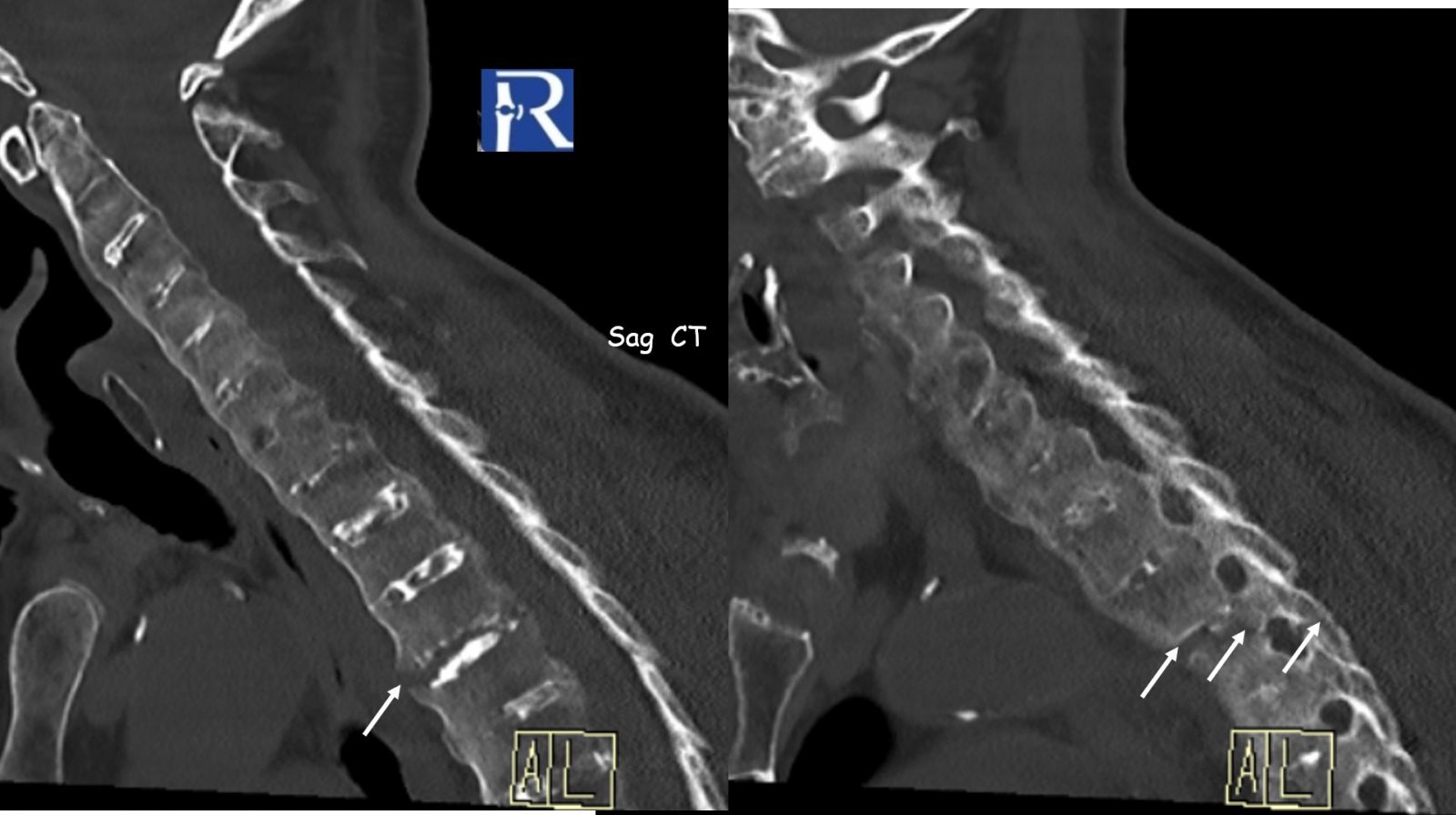 - Complete spinal ankylosis (“bamboo spine” morphology)