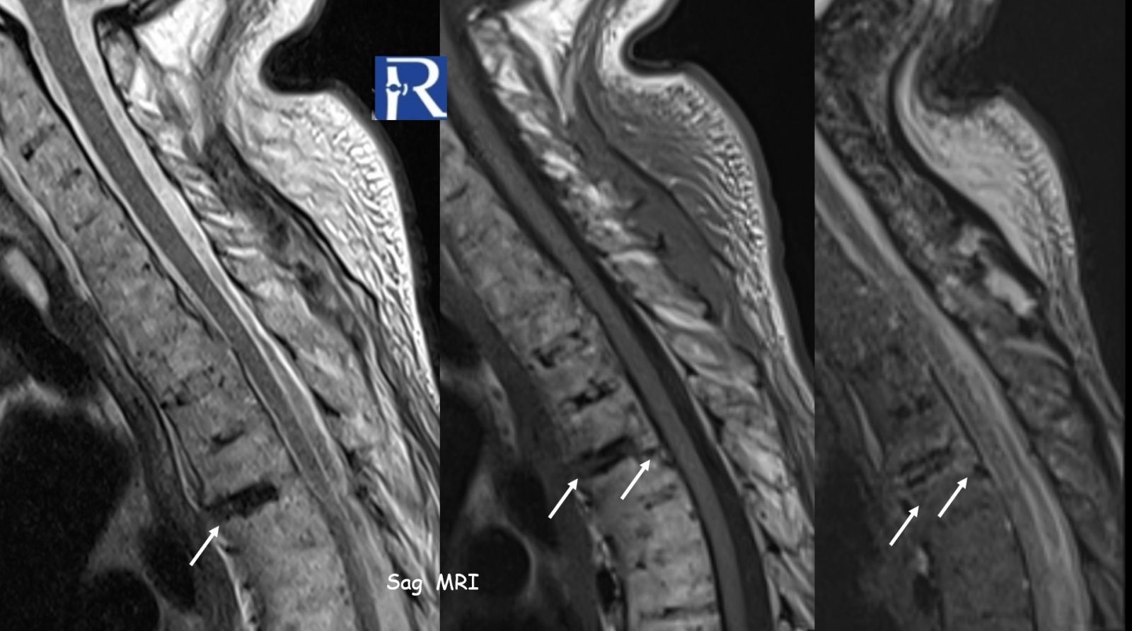 A 77-year-old patient with Ankylosing Spondylitis presented after a low-energy fall with acute thoracic pain.