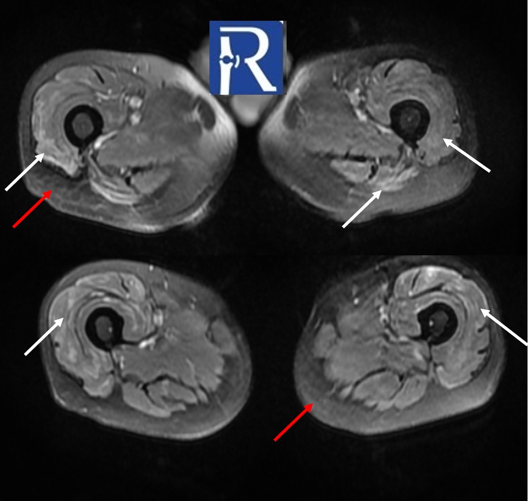 MRI of the both thigh reveals bilateral crescent-shaped, geographic lesions in the femoral heads consistent with osteonecrosis (formerly avascular necrosis) (yellow arrows). Additionally, there are bilateral, symmetrical, heterogeneous hyperintense signal changes—resembling edema—predominantly affecting the anterior muscle groups of the thighs (white arrows), indicative of myositis. There is also diffuse loss of subcutaneous fat tissue with focal areas of mildly increased T2 signal (red arrow).