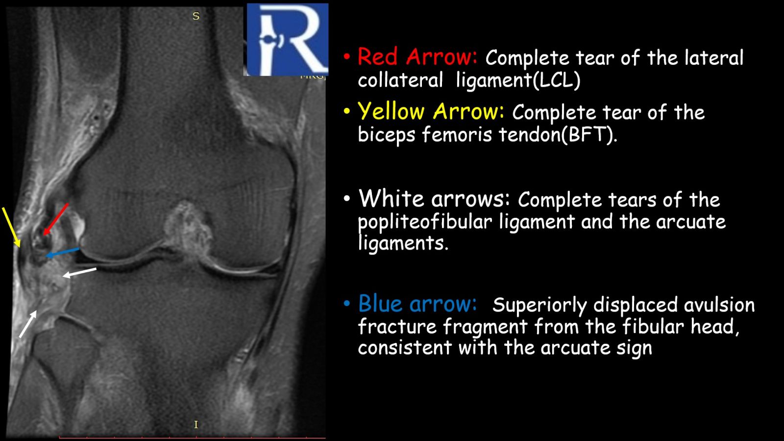 Plain radiographs demonstrated a superiorly displaced avulsion fracture of the fibular head, consistent with the arcuate sign. Although often subtle, this finding represents an avulsion at the insertion site of the arcuate ligament complex and is a well-recognized radiographic marker of posterolateral corner (PLC) injury. The fracture fragment is typically attached to the fibular (lateral) collateral ligament, the biceps femoris tendon, or both, and its size and displacement pattern may vary depending on the injured structure.