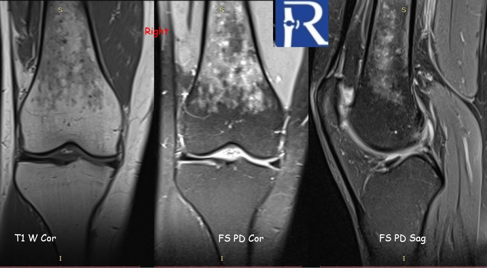Initial plain radiographs of both knees were unremarkable. However, further evaluation with magnetic resonance imaging (MRI) revealed subcubic lesions infiltrating the bone marrow of both femurs, demonstrated on T1-weighted and fat-suppressed proton density sequences. Given the patient’s prior diagnosis of sarcoidosis, the imaging findings were interpreted as consistent with osseous involvement of the disease.