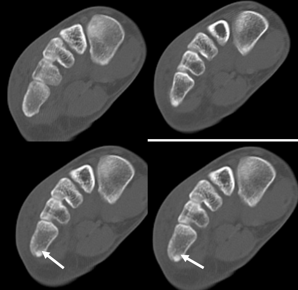 A foot radiograph revealed a suspicious radiolucency at the base of the 5th metatarsal (zone I). CT demonstrated a subtle fracture line on axial slices (indicated by white arrows). On reformatted sagittal and coronal planes, the non-displaced fracture line was clearly visible (white arrows), consistent with a pseudo-Jones fracture. Because the fracture can appear equivocal on plain radiographs and axial CT slices, long-axis reconstructions are essential for accurate evaluation in trauma patients.